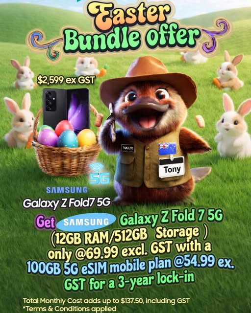 Celebrate this Easter with an exclusive limited-time offer on the Samsung Galaxy Z Fold7 5G. Experience next-generation innovation with a premium foldable smartphone paired with a powerful 100GB 5G eSIM plan, all bundled on a convenient 3-year lock-in contract.