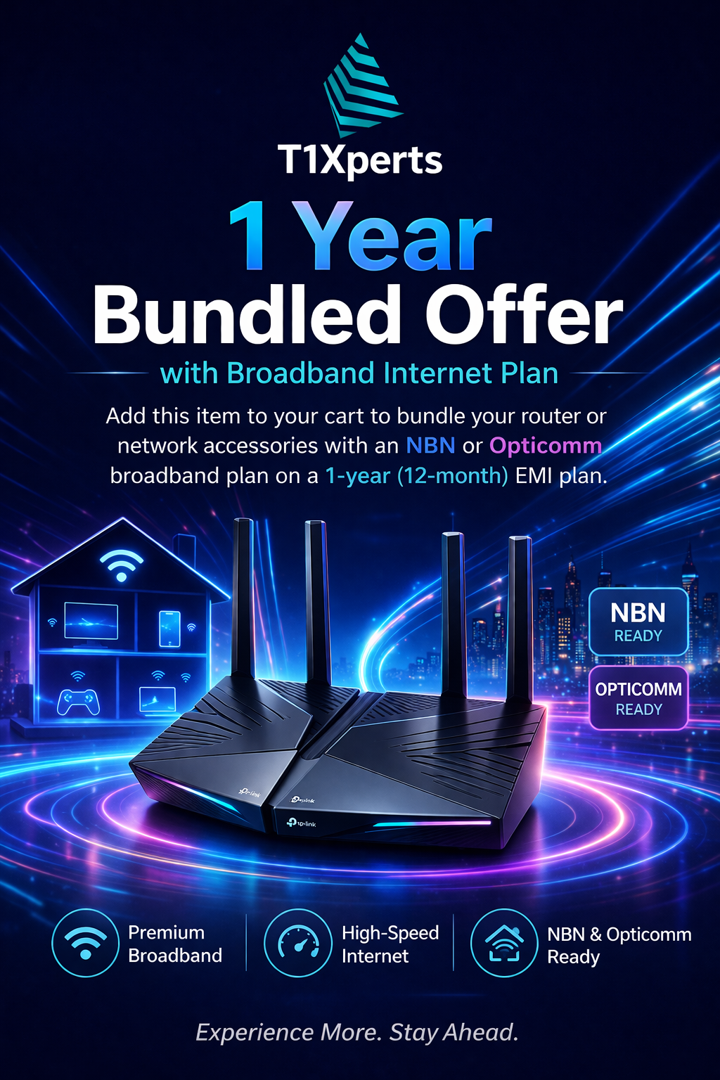Add this item to your cart to bundle your router or network accessories with a high-speed NBN or Opticomm broadband plan on a 1-year (12-month) contract.