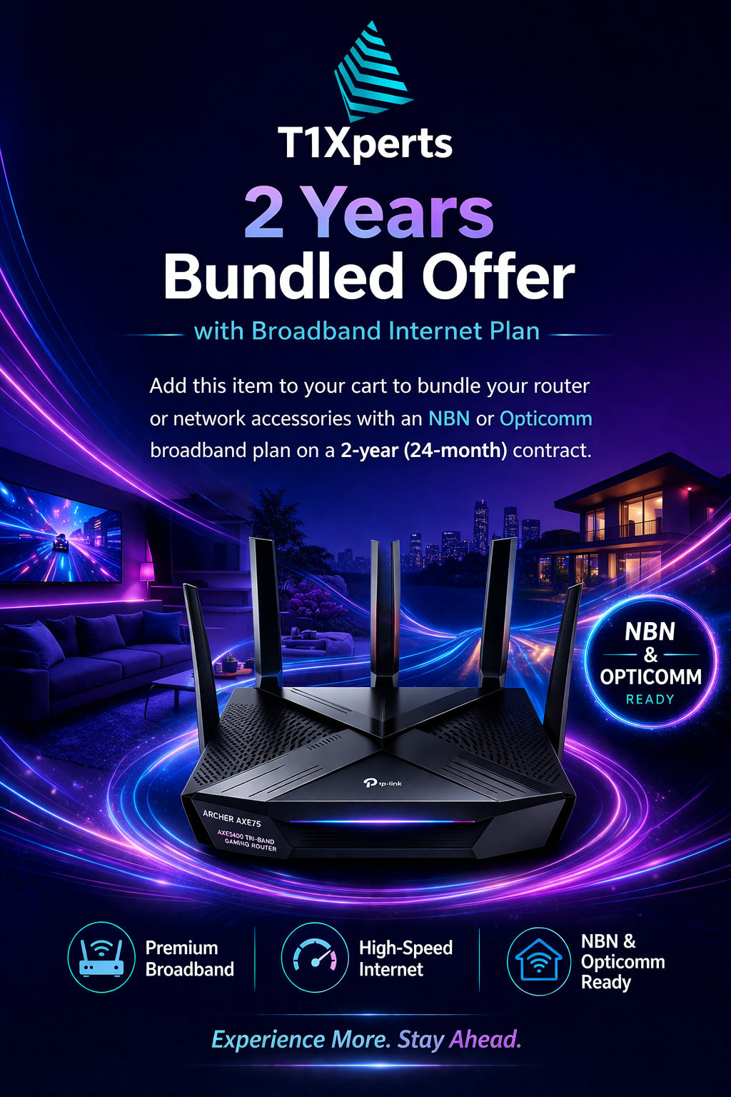 Add this item to your cart to bundle your router or network accessories with a high-speed NBN or Opticomm broadband plan on a 2-year (24-month) contract.