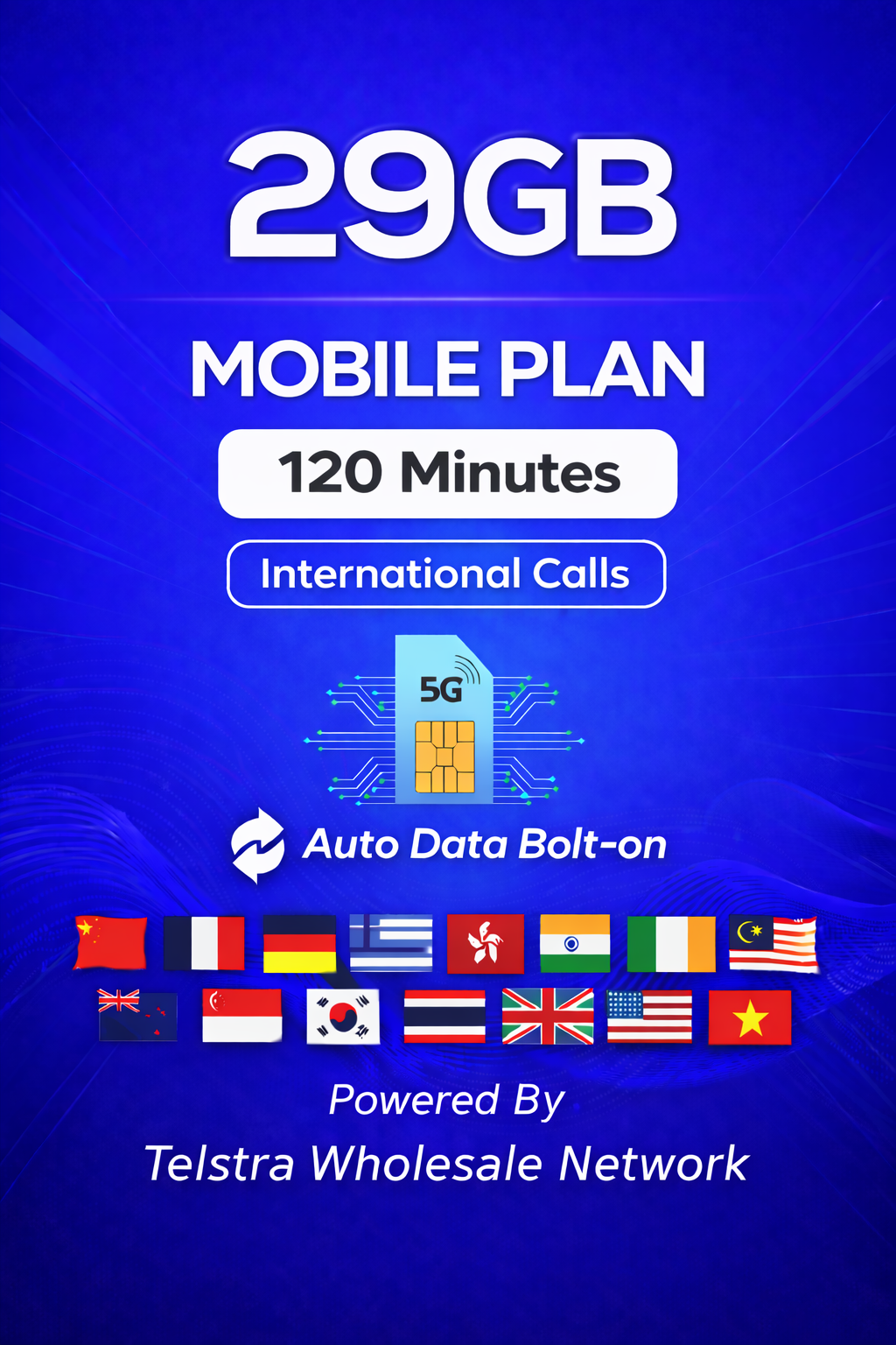 Important: 5G or 4G available in selected areas; speeds & coverage vary by location and device. International calling inclusions apply only to selected countries and are subject to fair-use policy. Services supplied via the Telstra Wholesale Network.