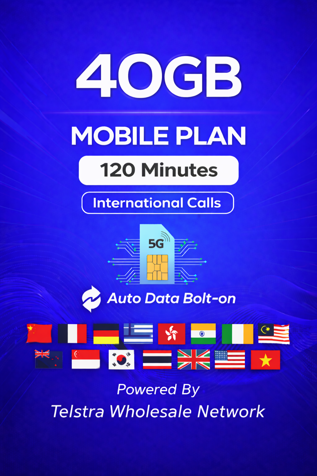 Important: 5G or 4G available in selected areas; speeds & coverage vary by location and device. International calling inclusions apply only to selected countries and are subject to fair-use policy. Services supplied via the Telstra Wholesale Network.
